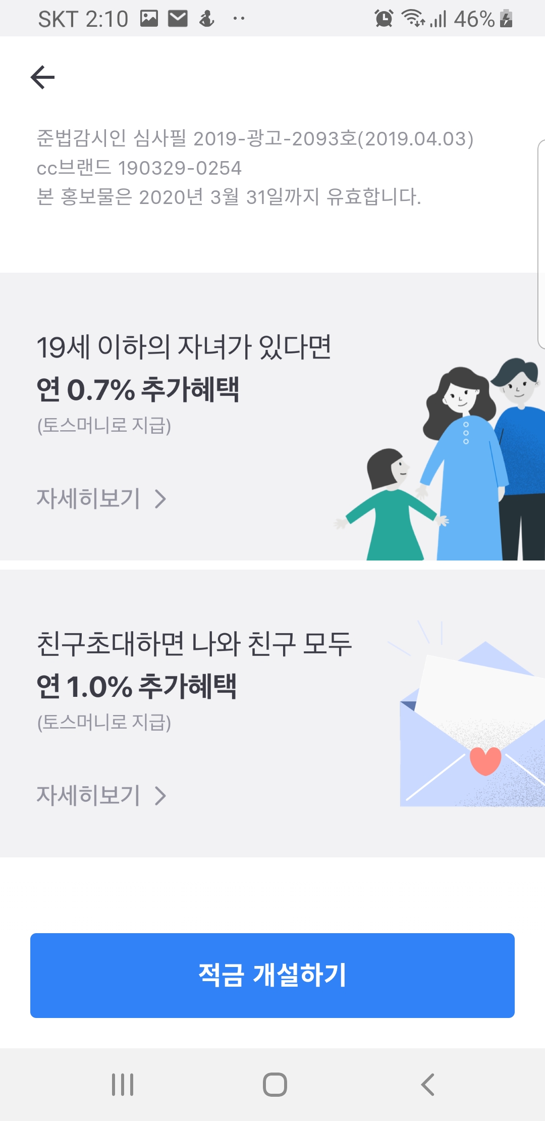 기본 3.3%이율에 19세 이하 자녀가 있으면 0.7% 추가, 토스 신규가입 시 1% 추가 이렇게 최대 5%까지 받을 수 있고 친구 초대 시 각자 1%씩 추가(월 10만원까지 적용) 이율을 받을 수 있다고 하니 괜찮네...