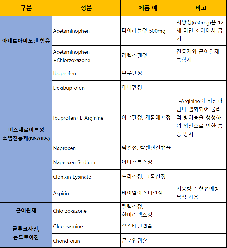 근골격계 통증에 사용하는 일반의약품과 관련하여 아래 질문에 대해 생각해 보고 답해보자.