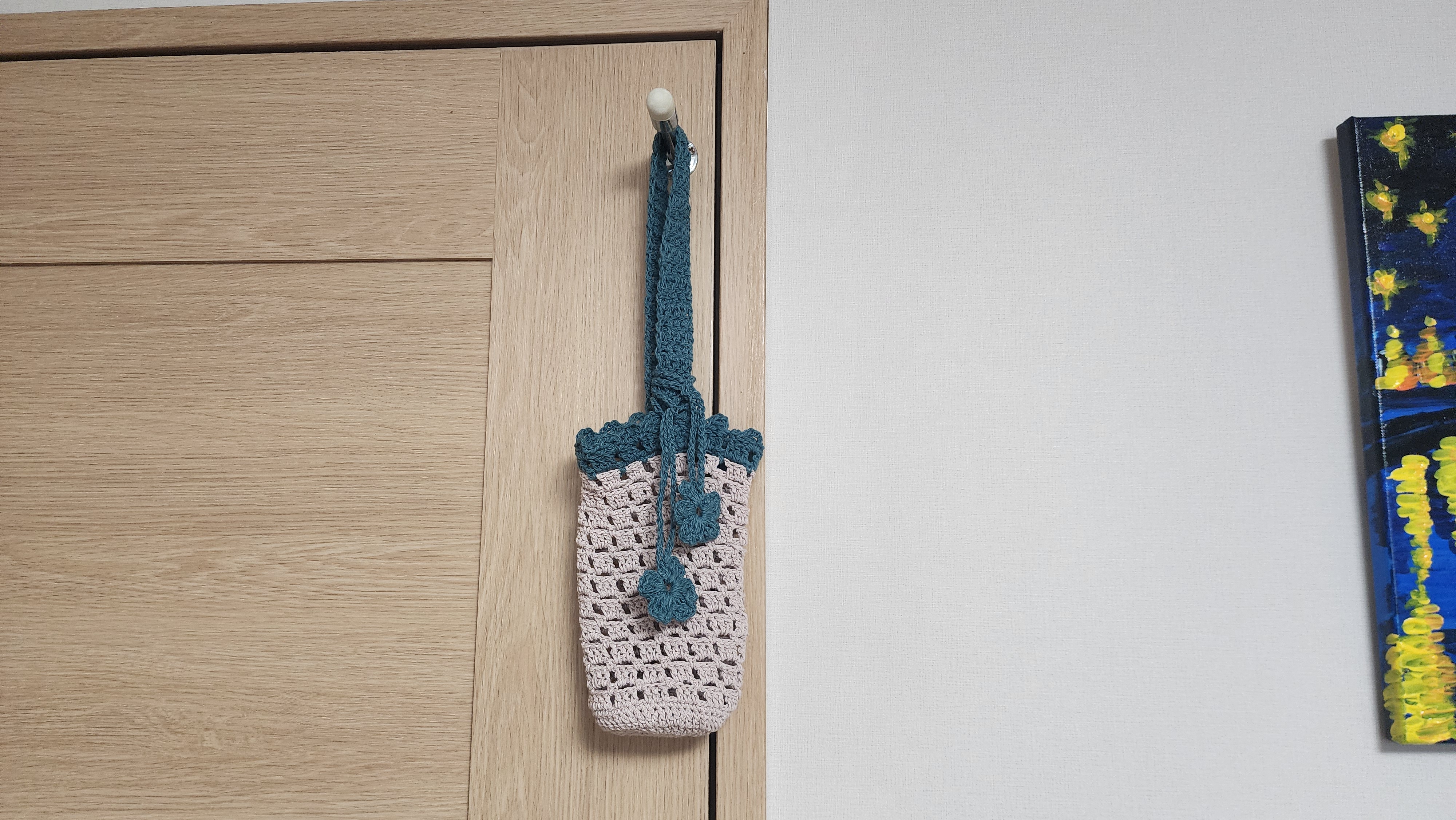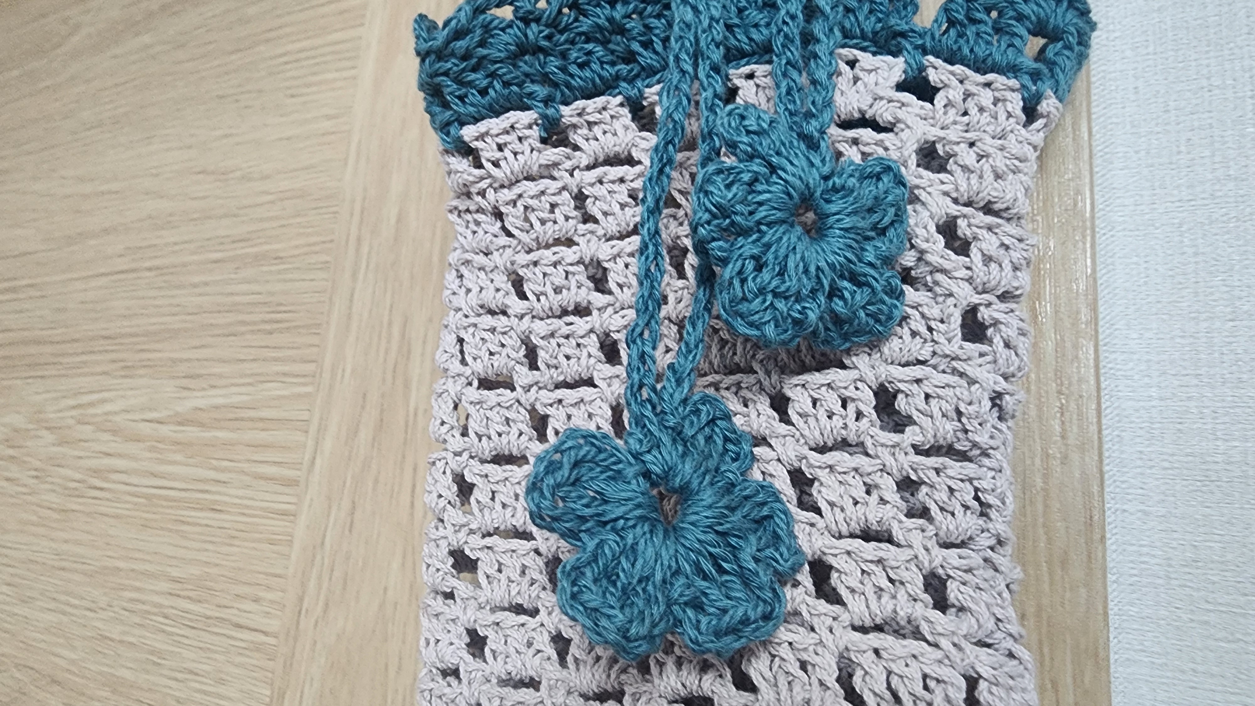 3. 청록색 배색실로 끈까지 다 뜨고도 좀 남아서 장식용 꽃도 몇개 떠줬는데 달아놓으니 예쁘다.