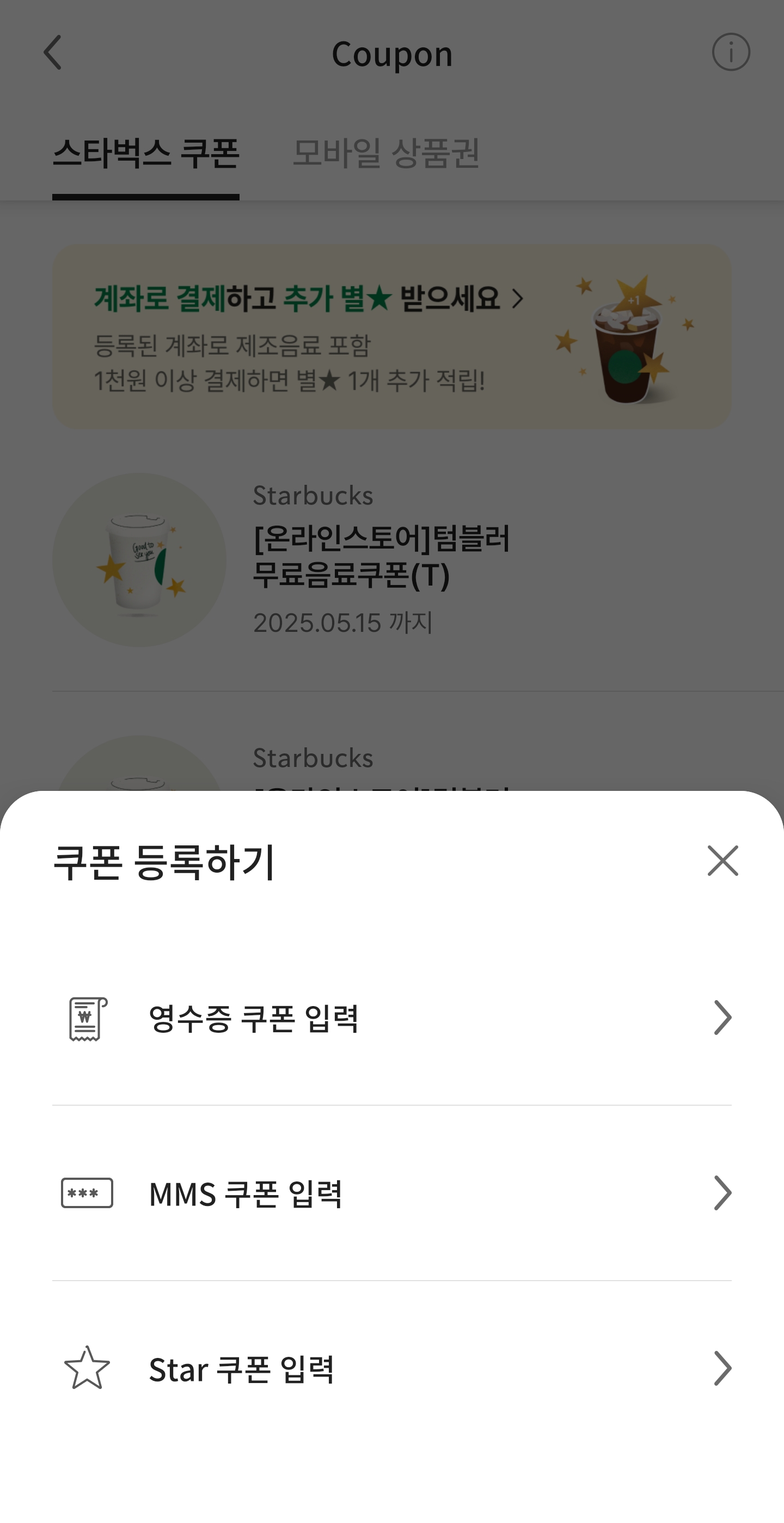 스타벅스 자주 이용하면 스타벅스 앱 활용해서 쿠폰을 등록해두면 사용하기 편리해요.