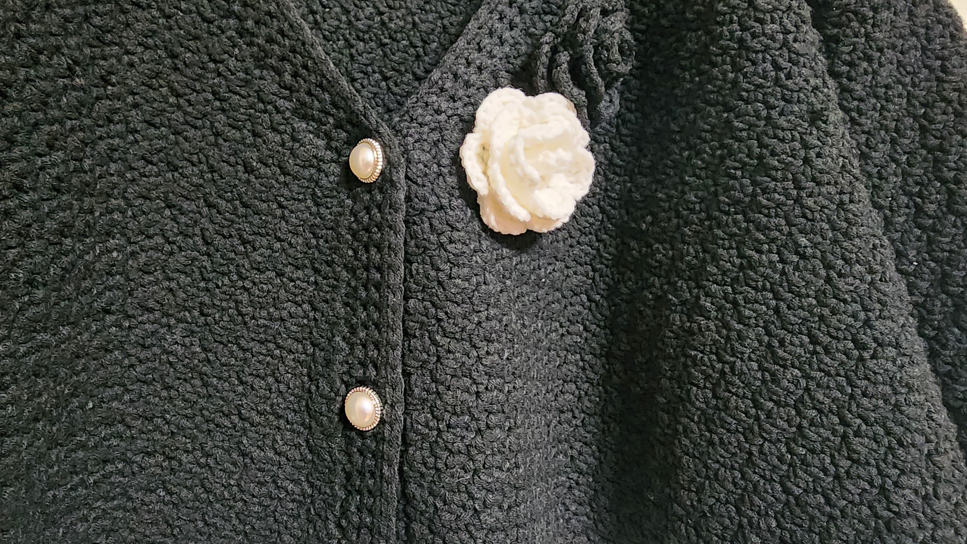 8. 남은 실로 검정, 흰색 꽃 코사지를 2개 떠서 달아주니 훨씬 예쁘다.