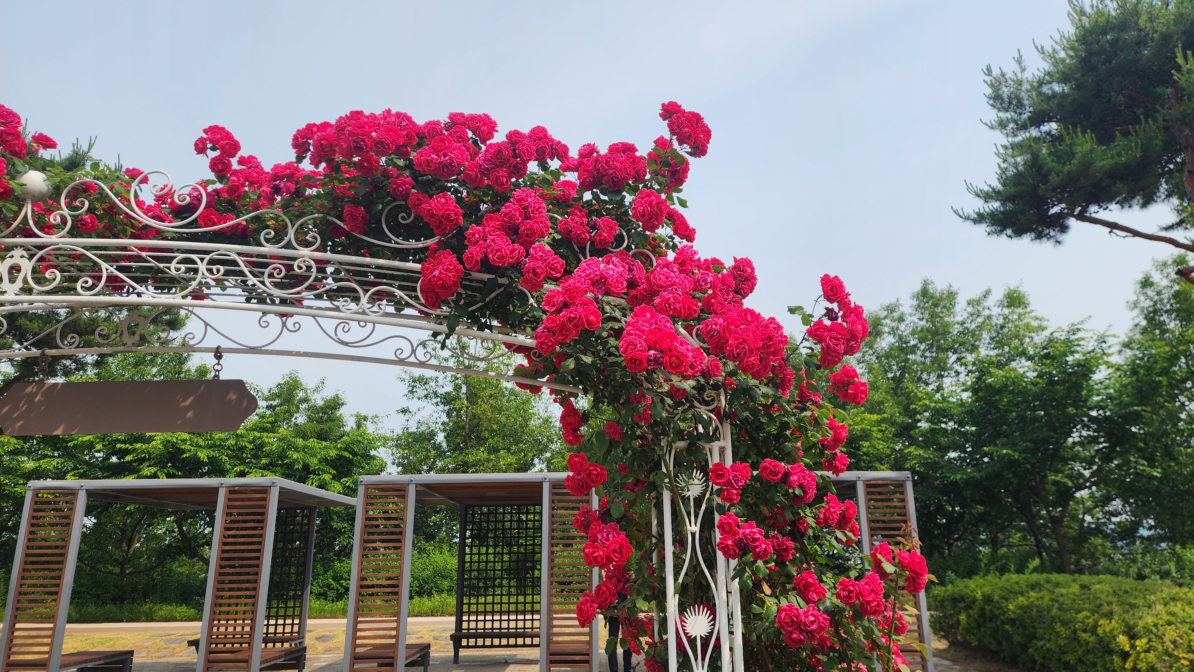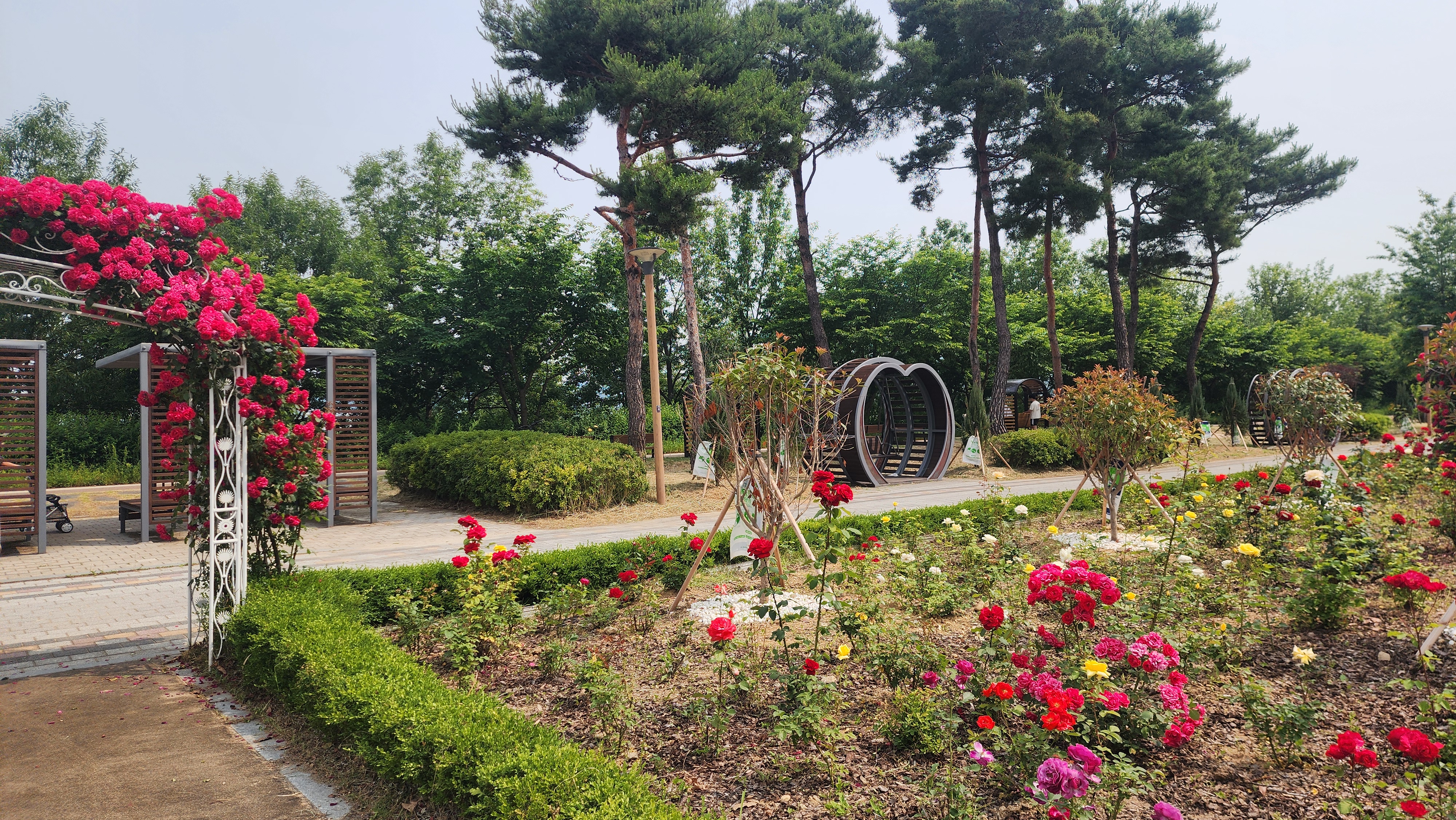 장미정원에는 다양한 종류의 가지각색의 장미꽃들이 피어 있어서 눈길을 사로잡았어요.