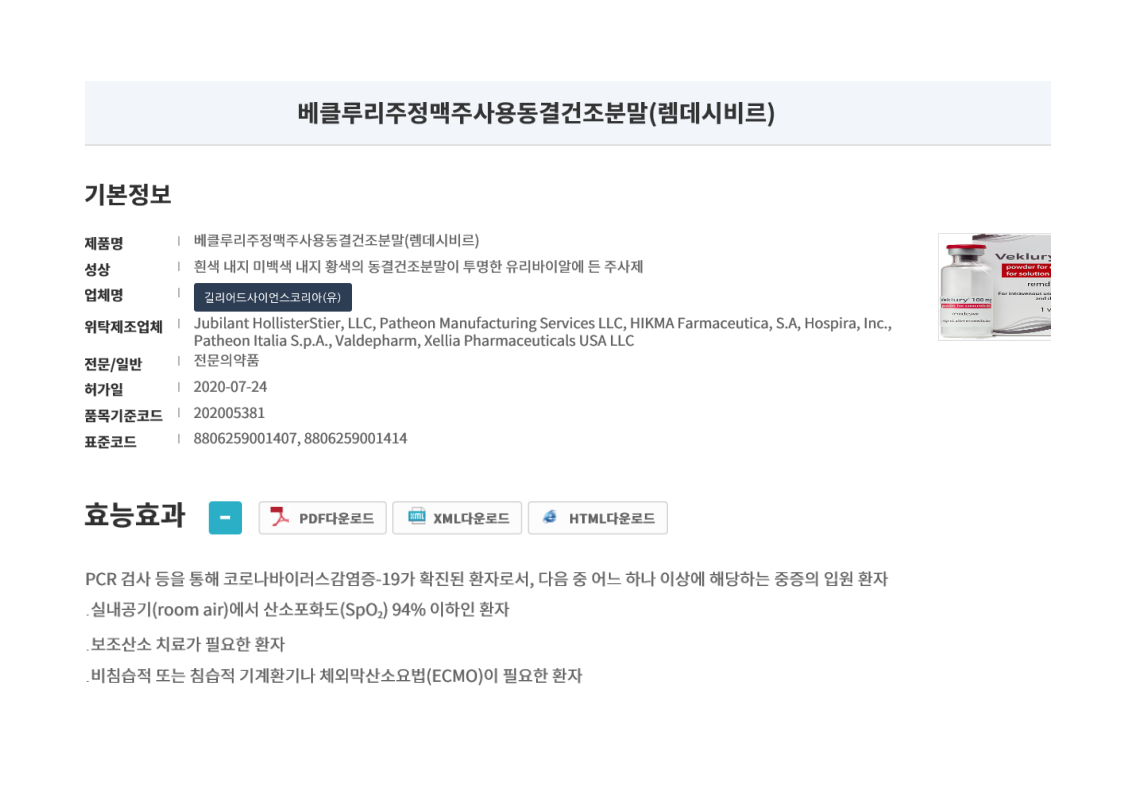 국내에도 2020년 7월 아래와 같이 수입허가되어 현재 중증의 코로나19 입원환자에게 사용중이다.
