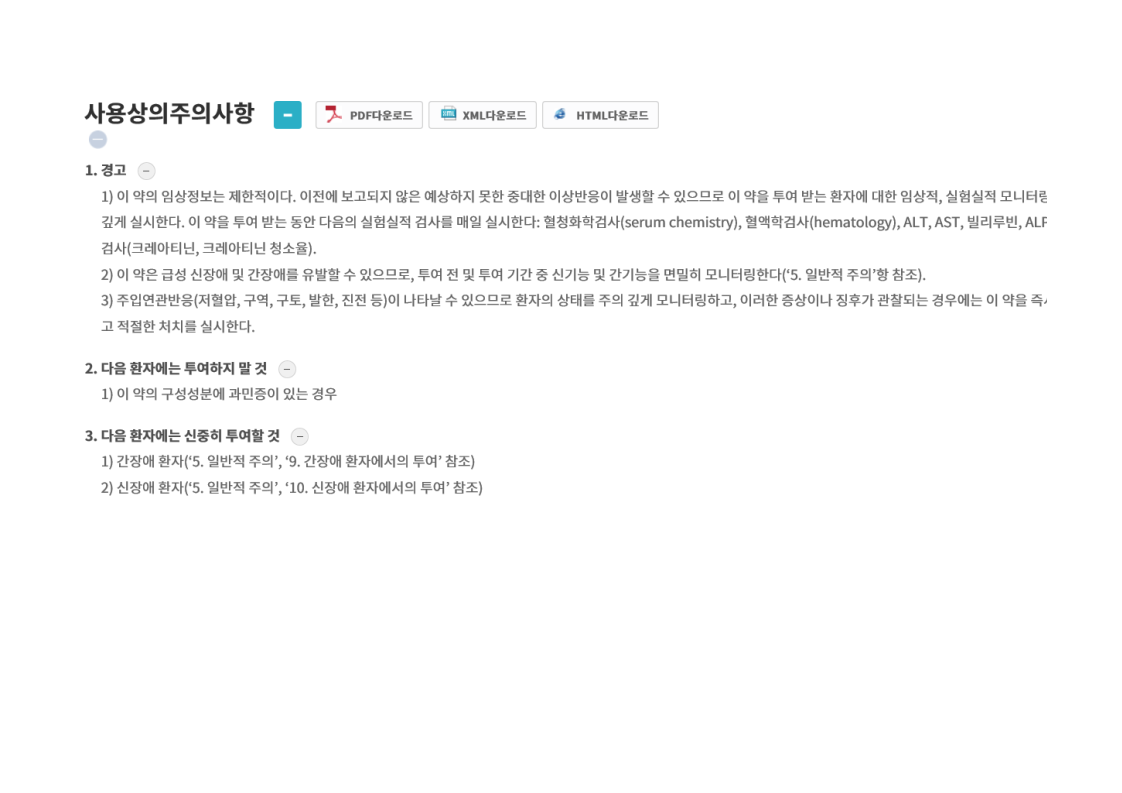 간세포에 염증이나 손상의 증후인 간 효소 수치 증가, 투여와 관련된 부작용인 저혈압, 오심, 구토, 발한, 진전 등의 증상이 나타날 수 있다. 구체적인 내용은 아래의 국내 허가사항 중 '사용상의 주의사항'에서 확인할 수 있다.