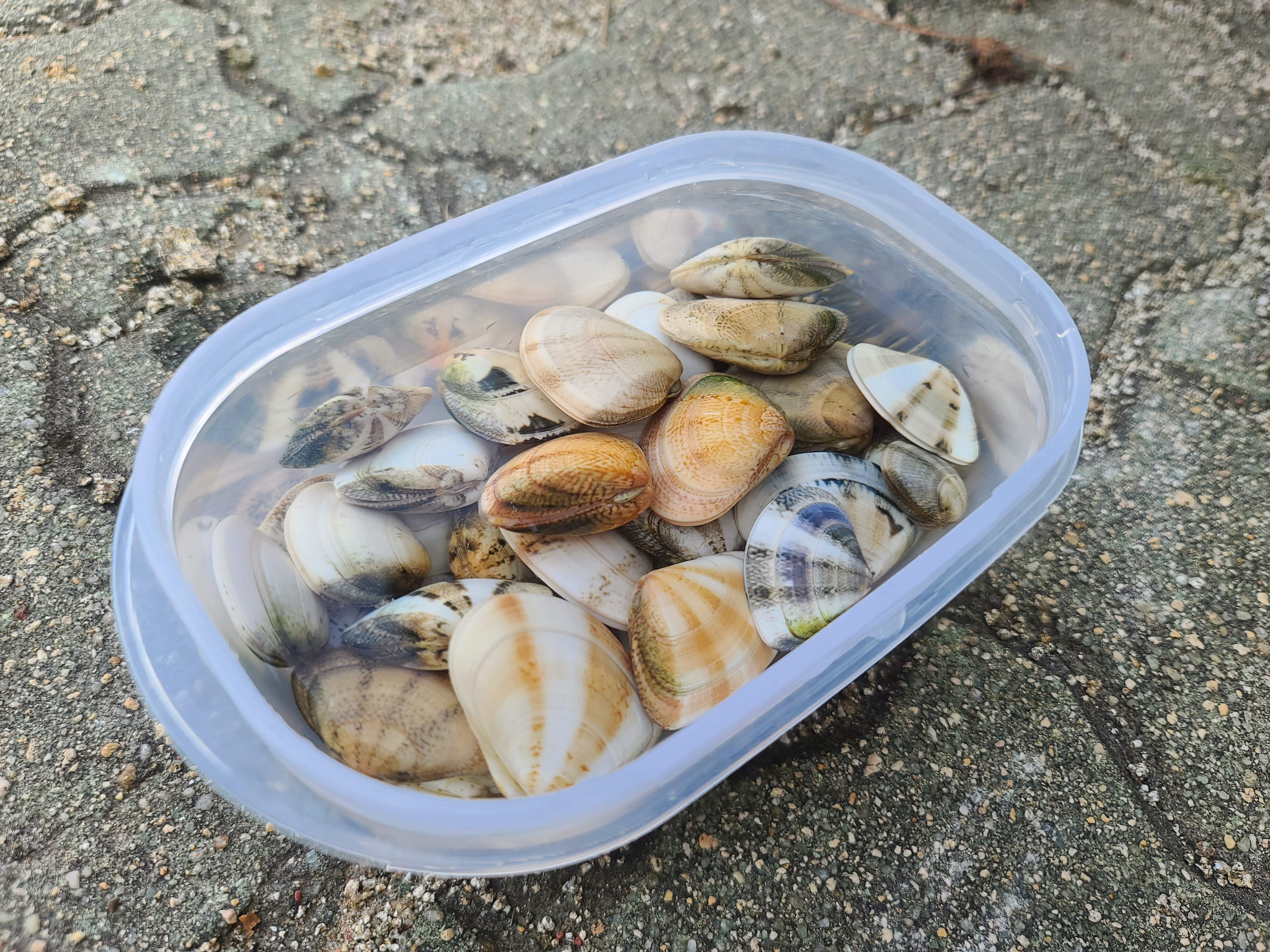 한참을 시원하게 해수욕 하며 더 즐거웠던건 발가락으로 모래를 조금만 파도 조개가 하나씩 나왔다. 살아있는 조개가 말이다. 어찌나 신기하고 재미있던지 요렇게 한 그릇 조개를 잡아 다음날 라면을 맛있게 끓여 먹었다.